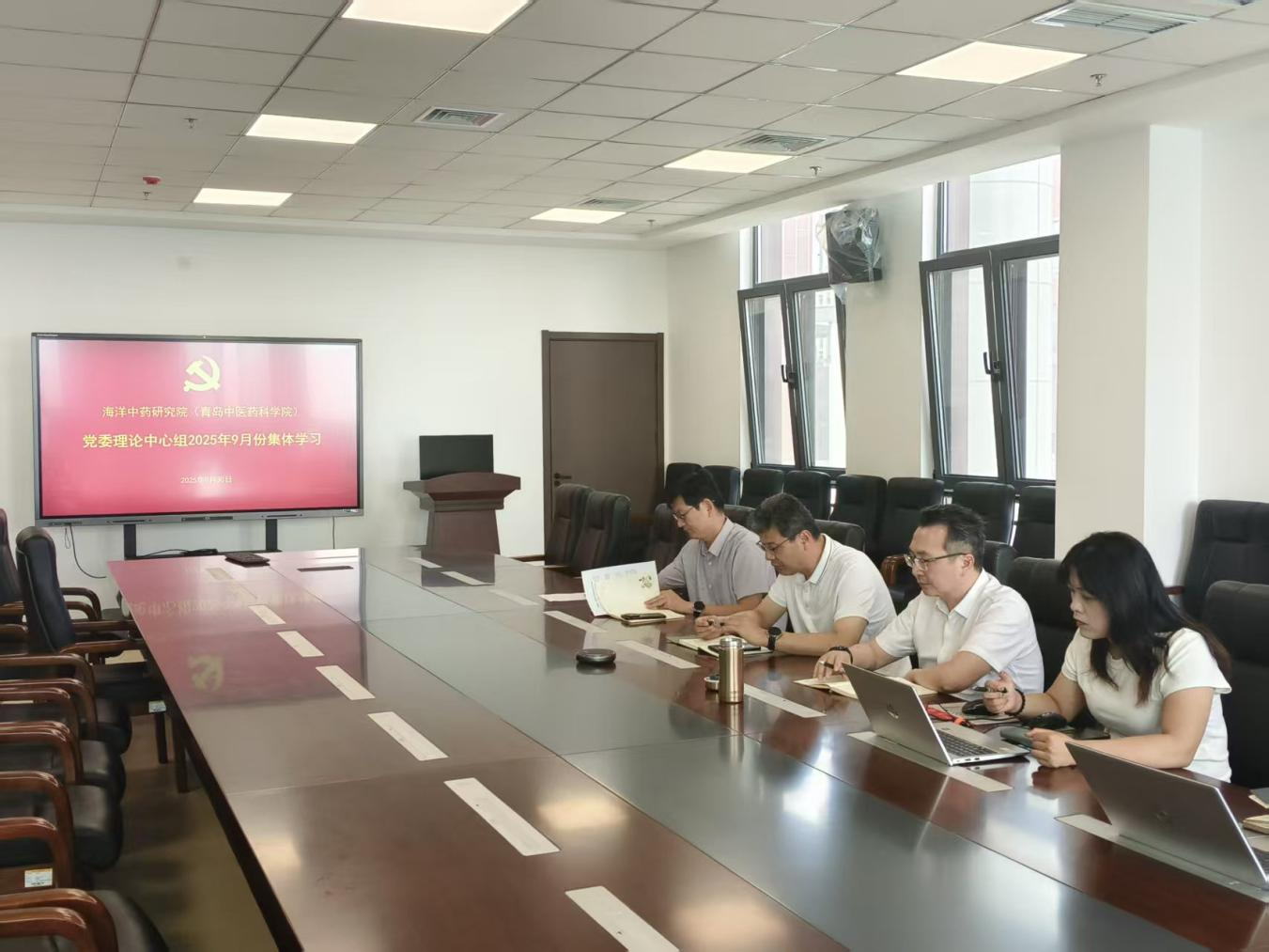 2025年9月30日,海洋中药研究院(青岛中医药科学院)党委理论学习中心组进行9月份集体学习,深入学习贯彻习近平总书记近期重要讲话和重要指示精神,专题学习研讨中央关于加强党的思想政治工作的等有关制度法规。党委书记赵衍刚主持会议,院长付先军列席会议,党委副书记李振阳,副院长侯林参加会议。