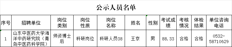 根据《山东中医药大学高层次人才引进公告》和学校“预聘-长聘制”引才(师资博士后)招聘要求,按照岗位招聘计划,山东中医药大学海洋中药研究院(青岛中医药科学院)组织完成了公开招聘考试、考察、体检等工作,现对拟聘用人员进行公示。公示期为7个工作日,2025年9月23日至2025年9月30日(不含节假日)。公示期间,如对公示人选有异议,请及时向学校人事处反映。